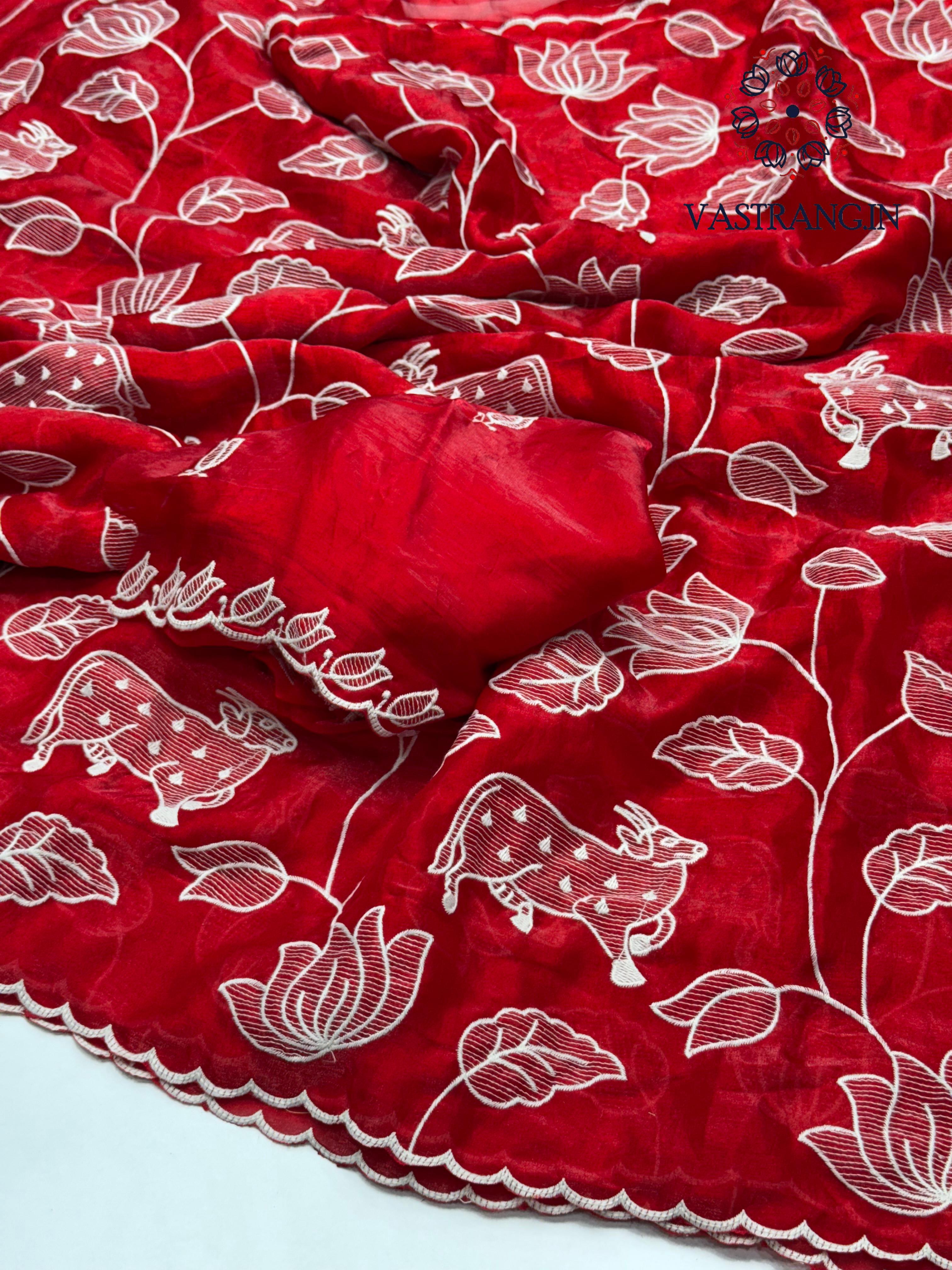 Beautiful Wedding Wear Red Colour Soft Crunchy Silk Embroidery Work Saree With Blouse