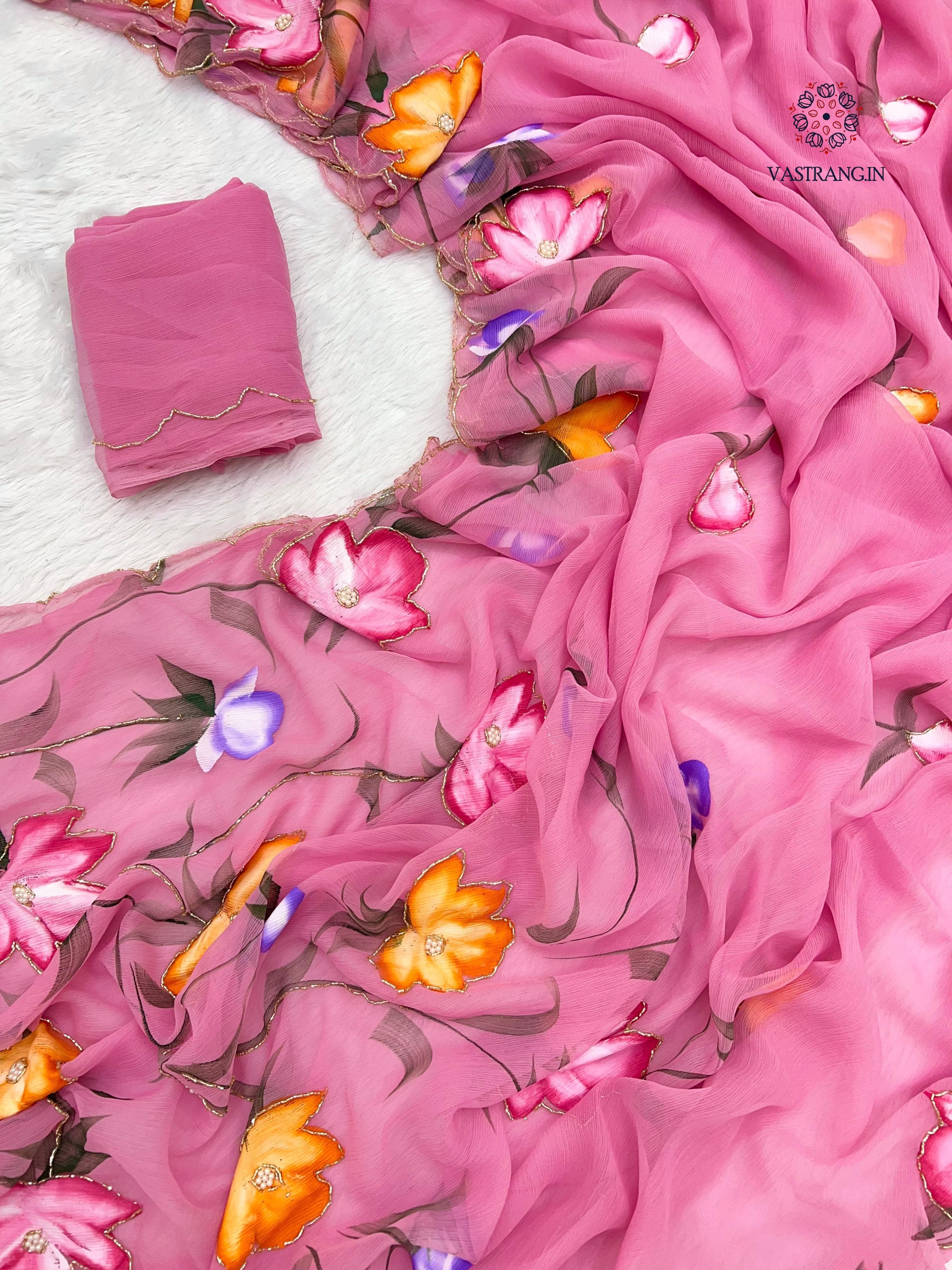 New Wedding Wear Soft Chiffon Handbrush Print n Handwork Fancy Designer Saree With Blouse