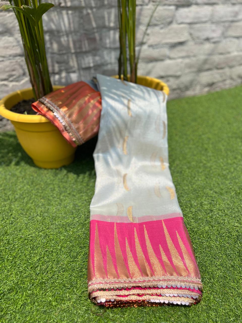 New Wedding Wear Silver Color Banarasi Tissue Silk Zari Weaving With Lace Work Fancy Designer Saree