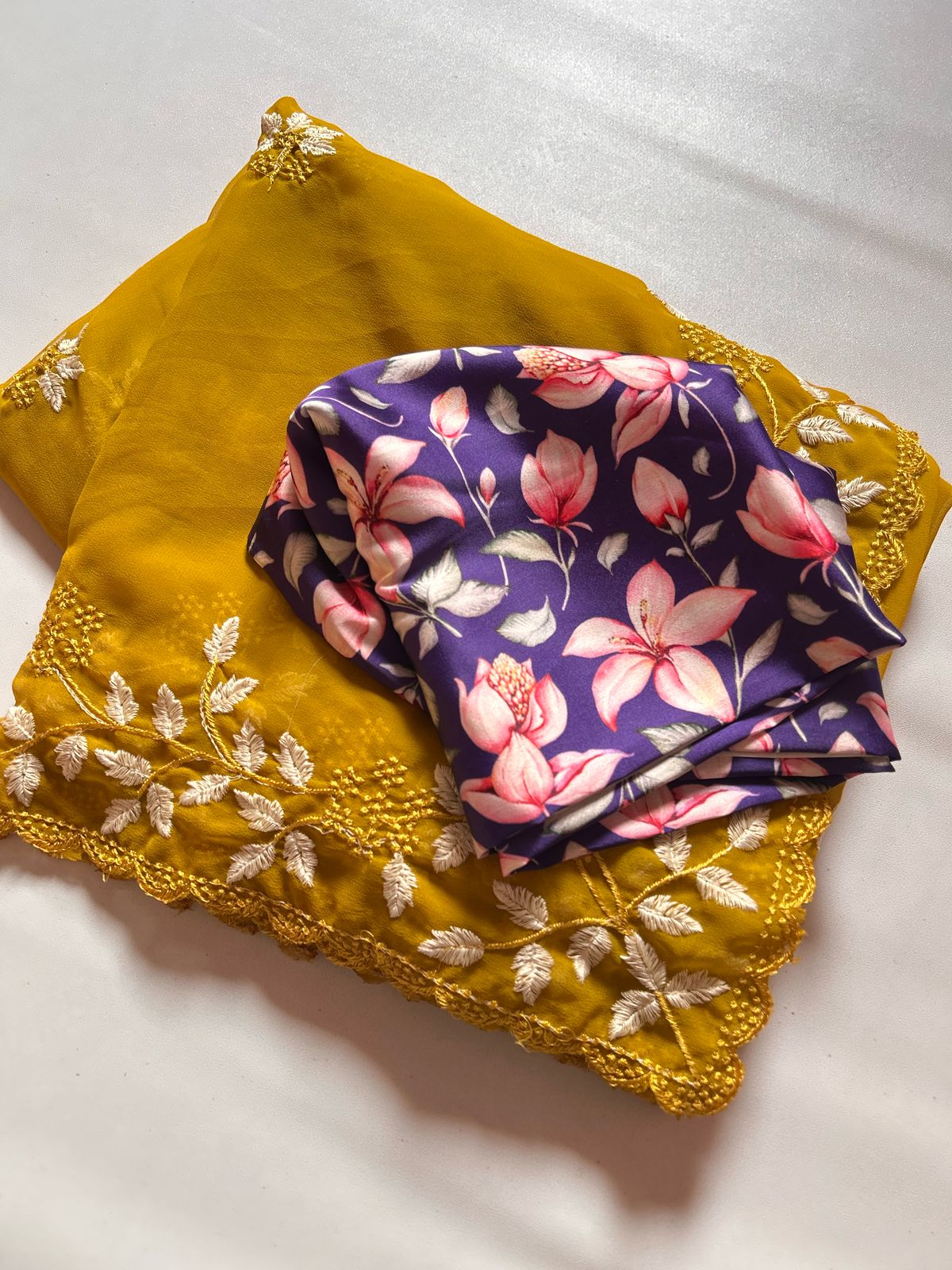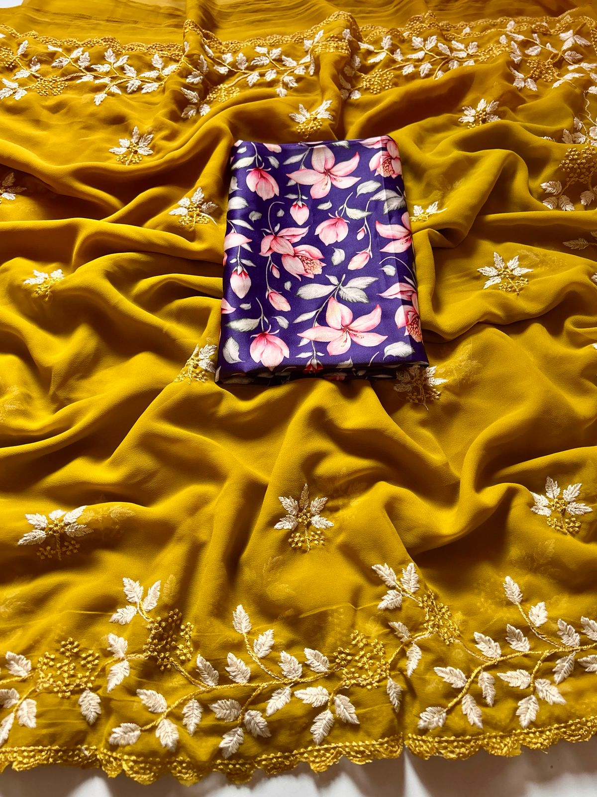 Partywear Georgette Mustard Color Embroidered Border Work Fancy Designer Saree With Blouse