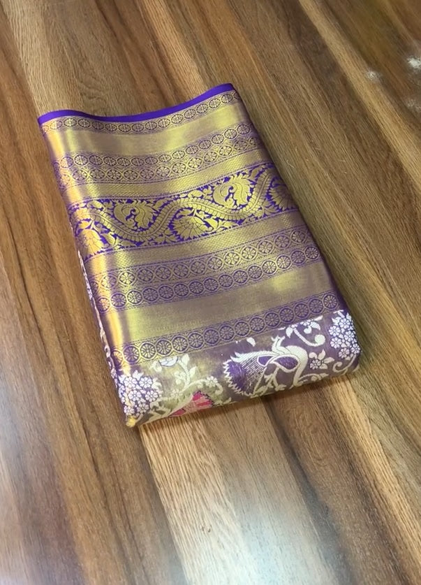 Purple n Gold-Toned Jacquard Woven Design Kanjivaram Pattu Silk Saree