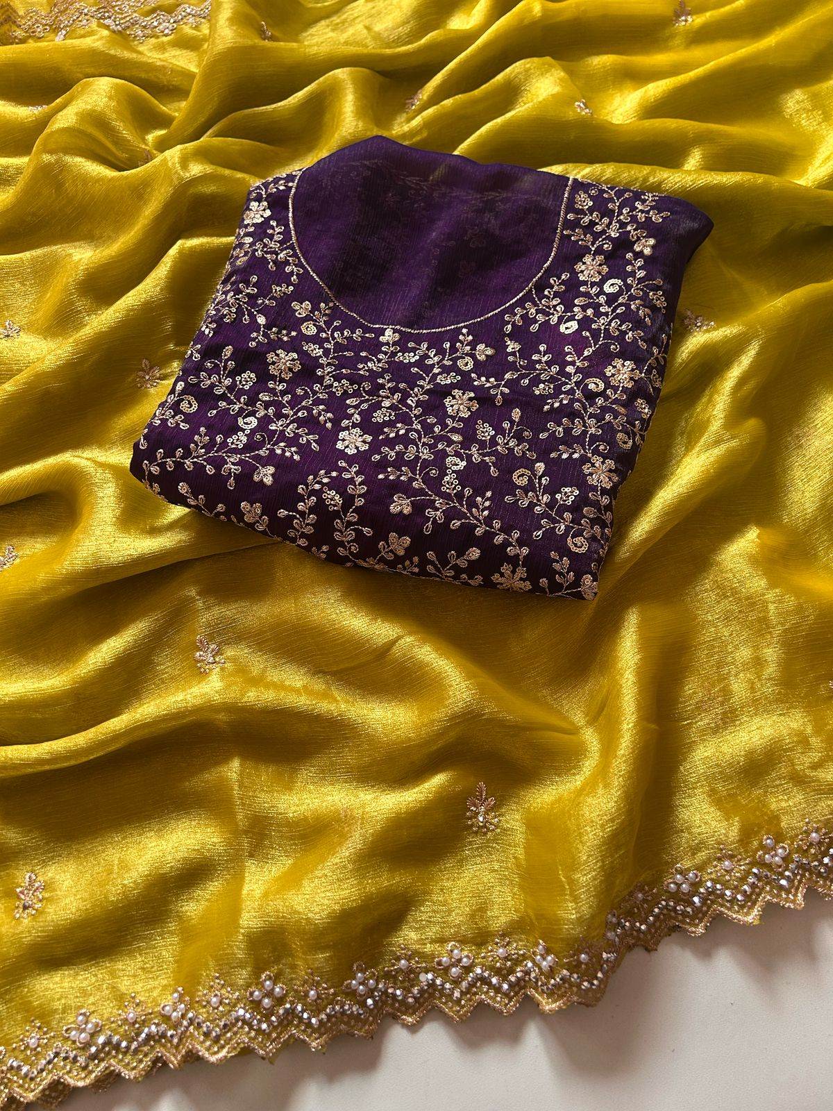 Yellow Crunchy Chiffon Silk With Beautiful Embroidery n Cut Work Partywear Fancy Designer Saree With Heavy Work Blouse